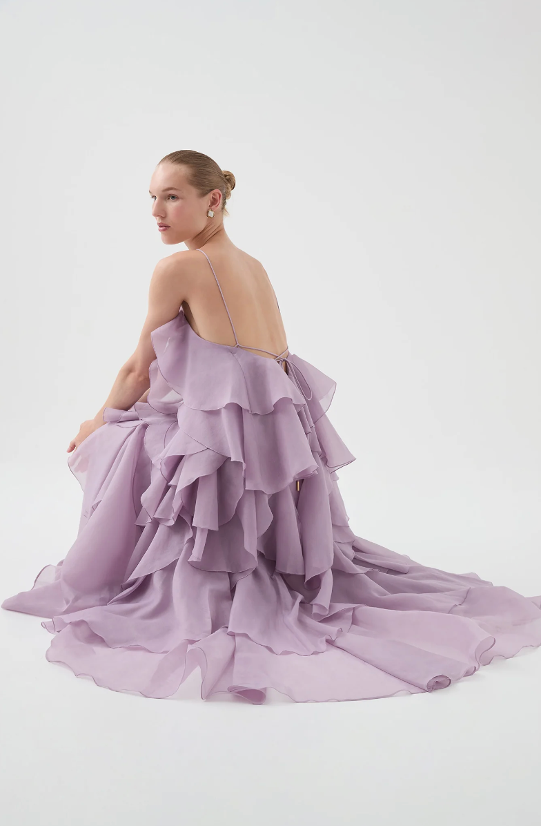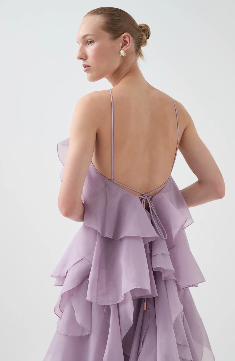 Experience effortless elegance with the AJE Pandorea Maxi dress in lavender purple. This stunning maxi dress features a voluminous silhouette and layered ruffles throughout, giving it a playful feel. The halter neckline and adjustable straps with back ties allow for an adjustable fit