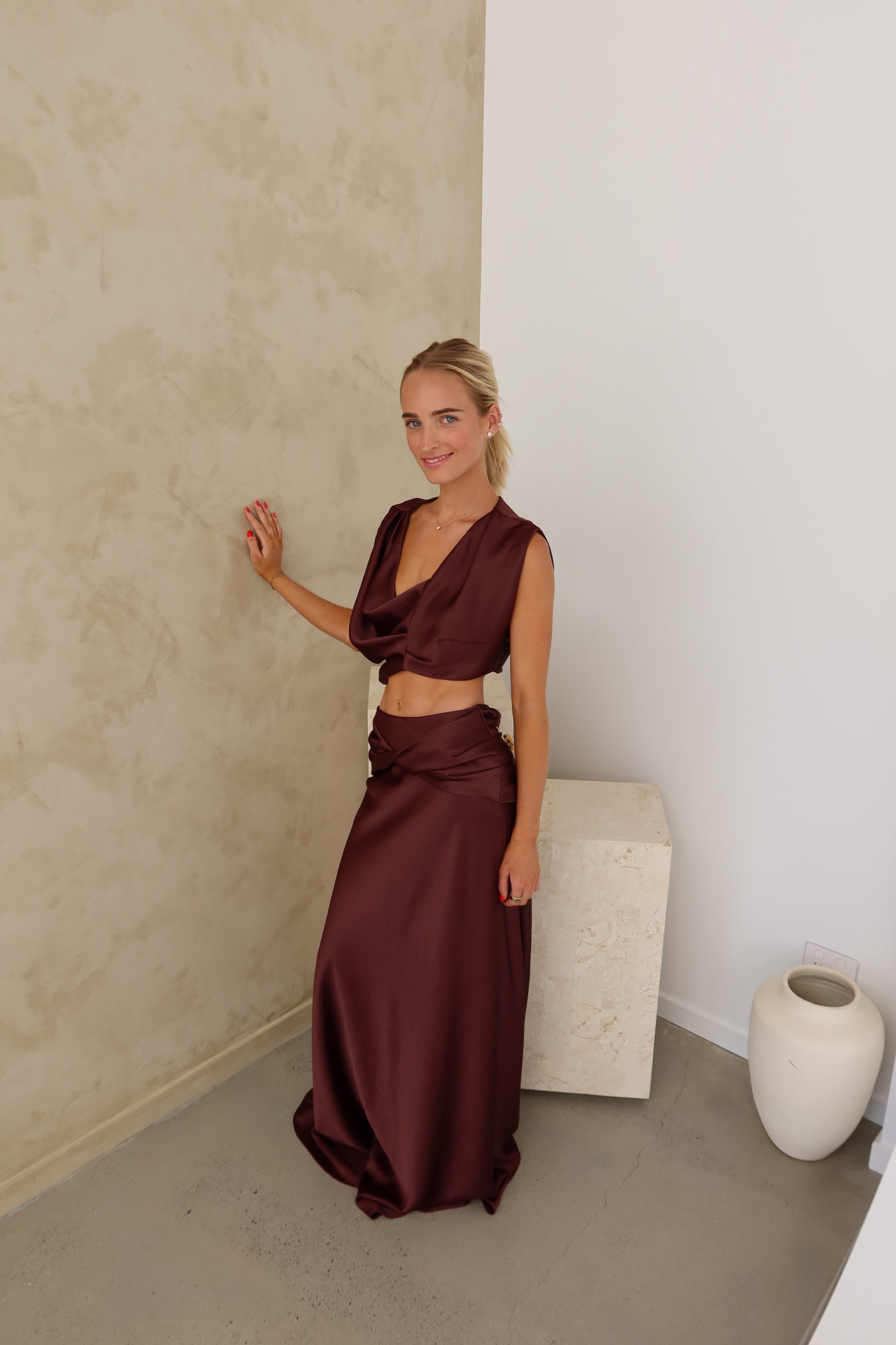 Introducing the Andi top, crafted in a luxe cacao satin. She is designed to elevate, featuring a wide draped neckline that gracefully sweeps across the décolletage. A subtle v-line detail under the bust contours the feminine form while elongating the torso. Effortlessly chic, she pairs seamlessly with the matching Andi skirt for a complete set or style her individually for versatile elegance. She is ideal for daytime celebrations and afterdark moments.