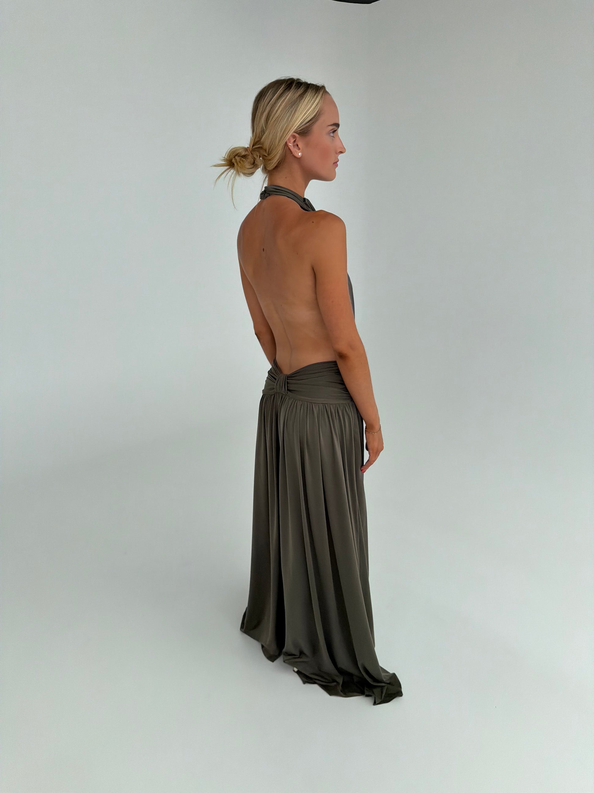Introducing Santina, a draped silhouette crafted for ease and versatility. Made from a slinky khaki drape, she features a timeless halter neckline and a low-set waistband to anchor. The dress softly drapes over the body with gentle gathers, finishing effortlessly floor-length. Complete with a sensual open back and a ruched centre detail, Santina is made for warm nights and confident moments.