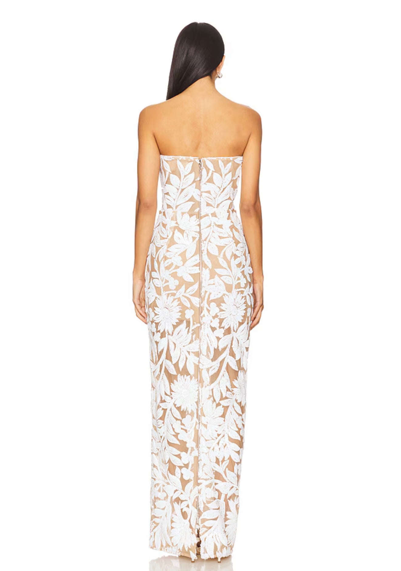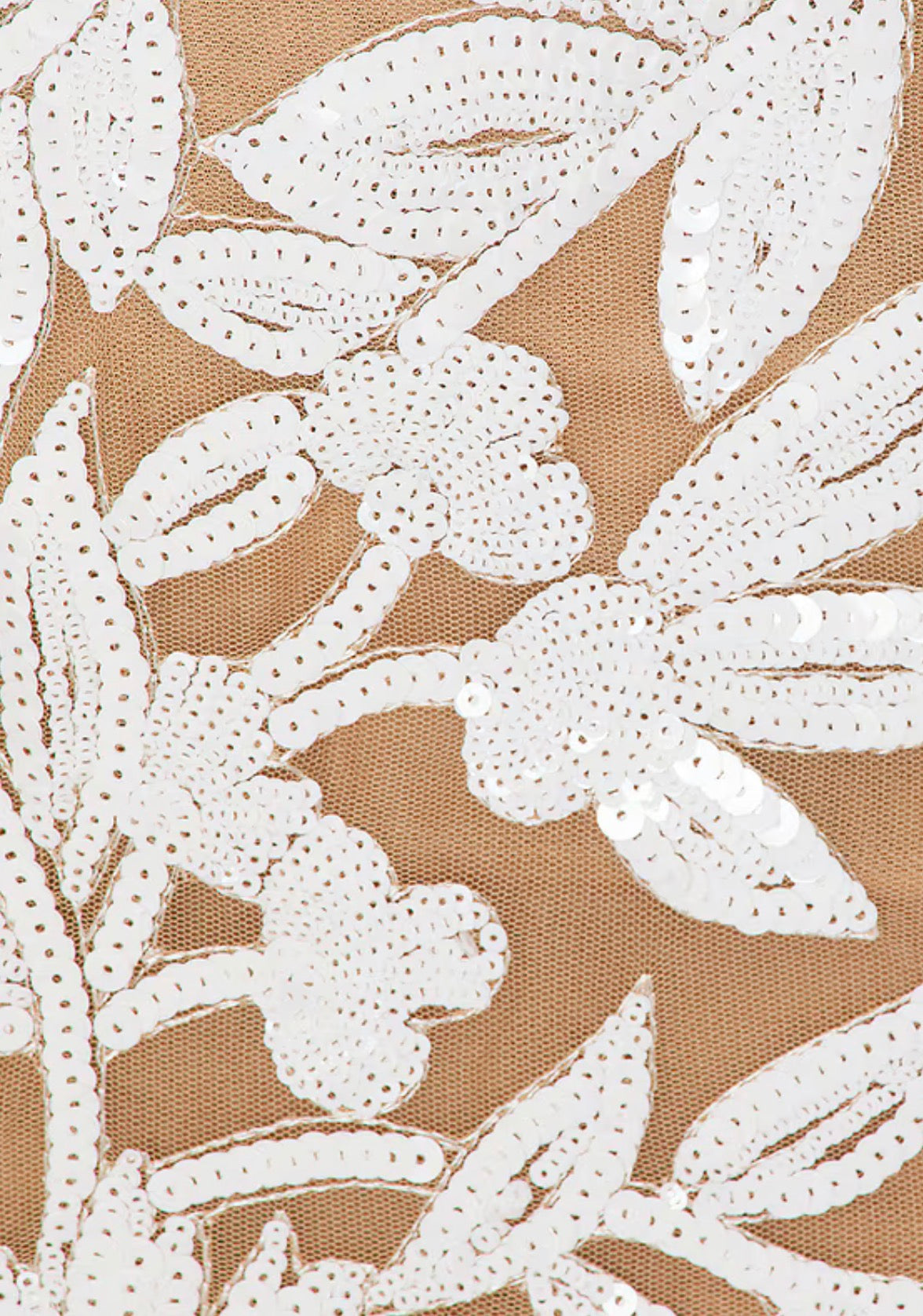 Dahlia is crafted in a striking white sequin floral design that catches the light beautifully with every movement. The structured, boned bodice provides exceptional support and creates a flattering, sculpted silhouette. Made from a mid-weight sequin fabrication, it balances statement glamour with comfortable wearability. Finished with a contemporary exposed two-way back zip for both function and elevated style.