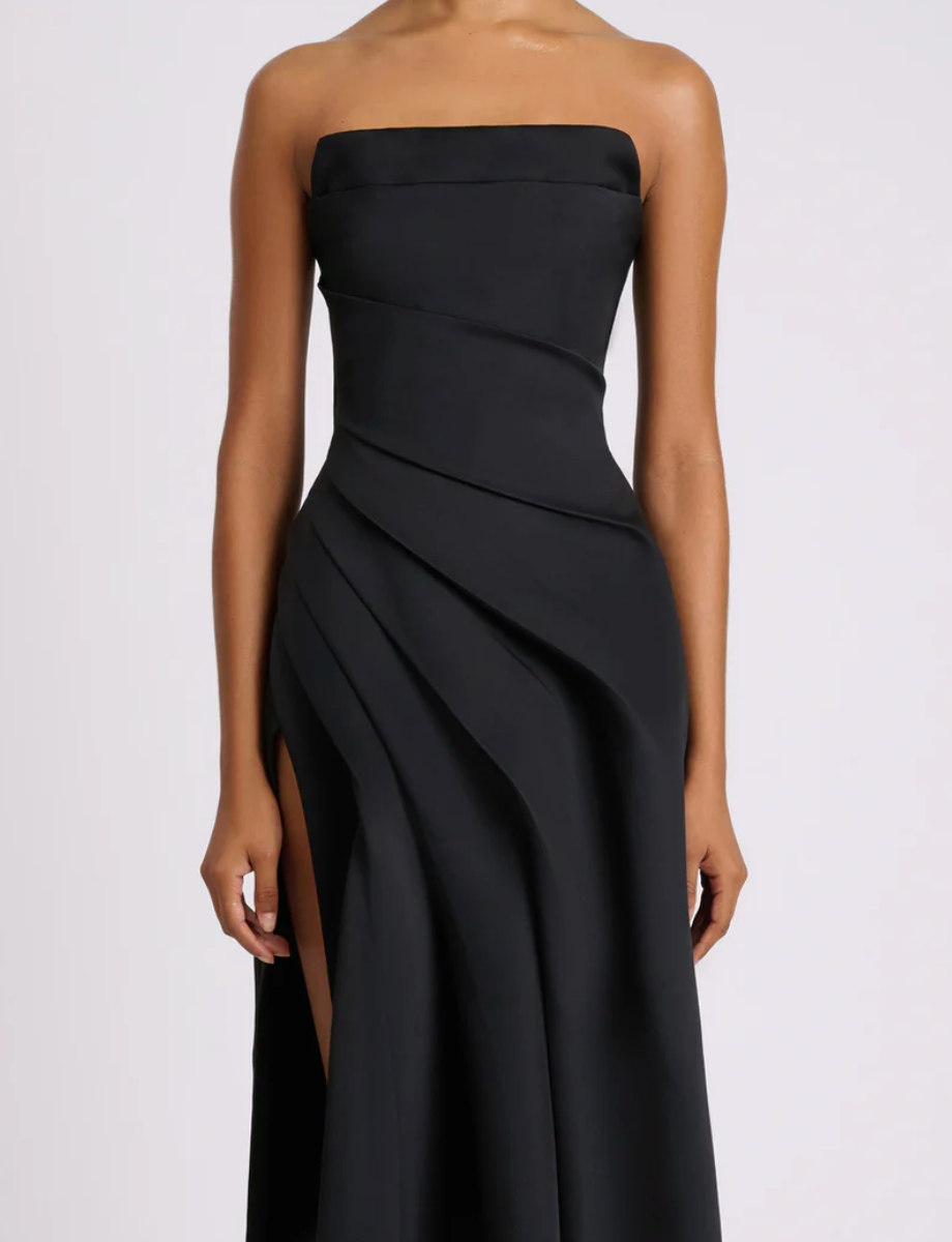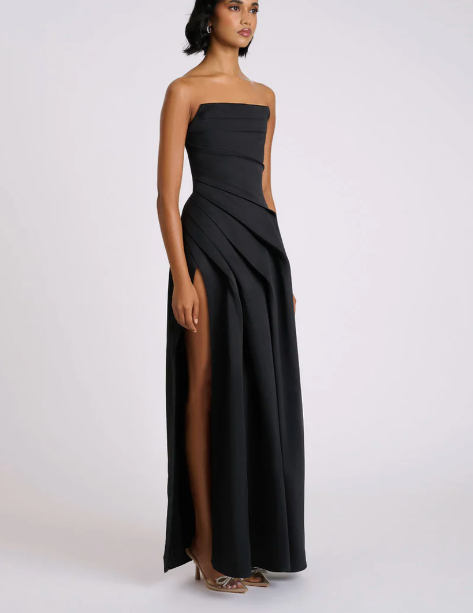 The exquisite pleats create dynamic, yet refined movement with every step, enhancing the gown’s overall elegance. A daring thigh-high side slit adds a touch of allure and modernity, offering a bold contrast to the gown's classic structure.