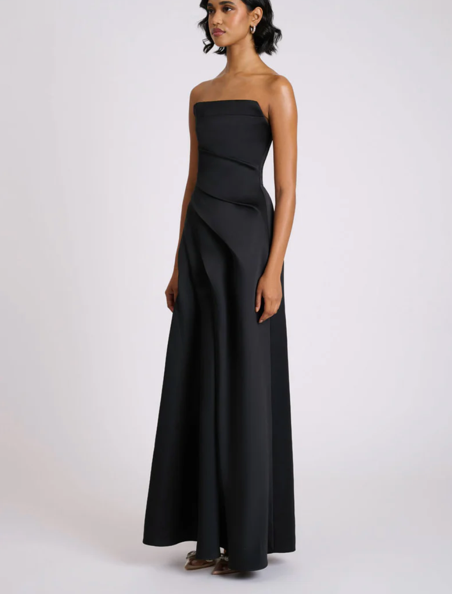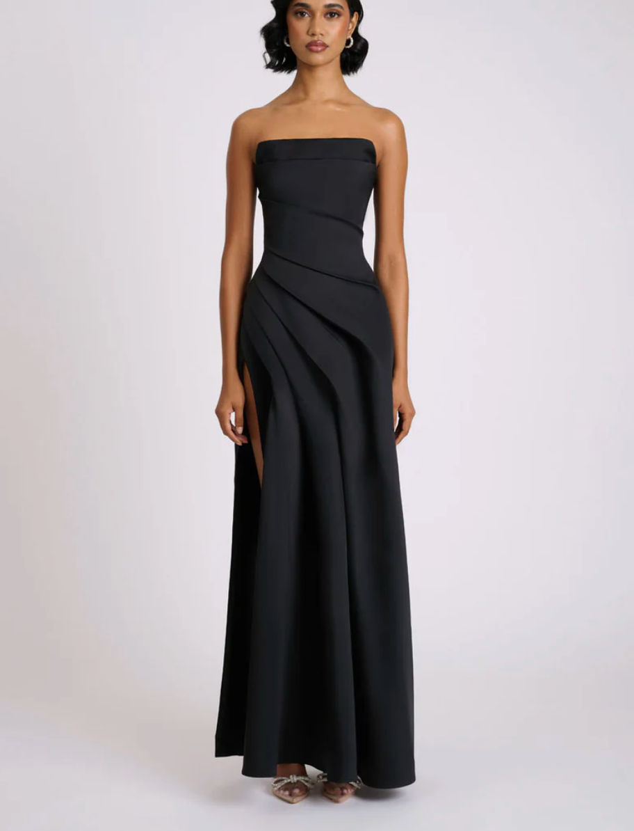 Meet the Deanna Gown, the embodiment of graceful sophistication and timeless beauty. Featuring a flattering strapless neckline, this gown seamlessly flows into elegant pleated draped folds that begin at the right waist, cascading down to the floor in a stunning, fluid silhouette.