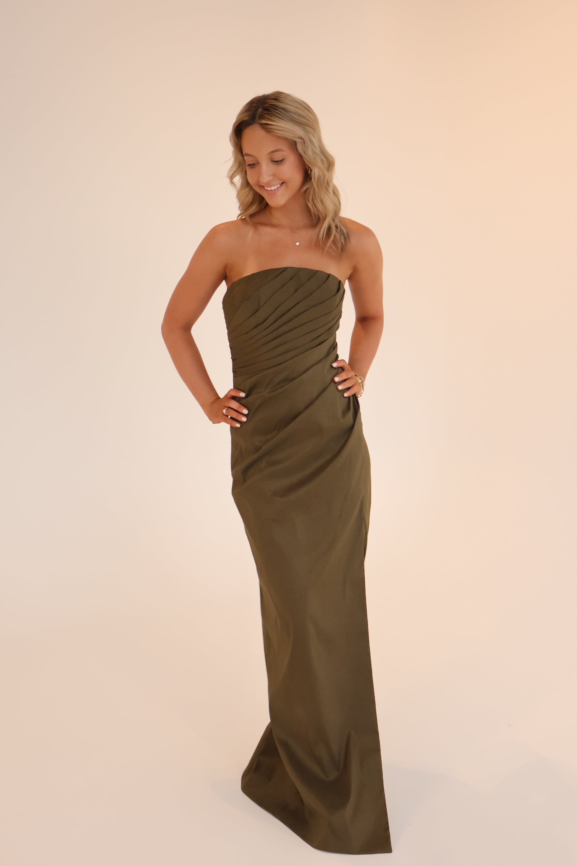 Designed as the quintessential strapless gown, the Mira features hand draped ruching across the bust and waist to flatter the female form. Internally constructed with signature Rachel Gilbert corsetry and waist tapes to provide support and define shape, the Mira is crafted from stretch taffeta to allow ease of wear and movement for the moments celebrated. This silhouette features a front thigh-high split.