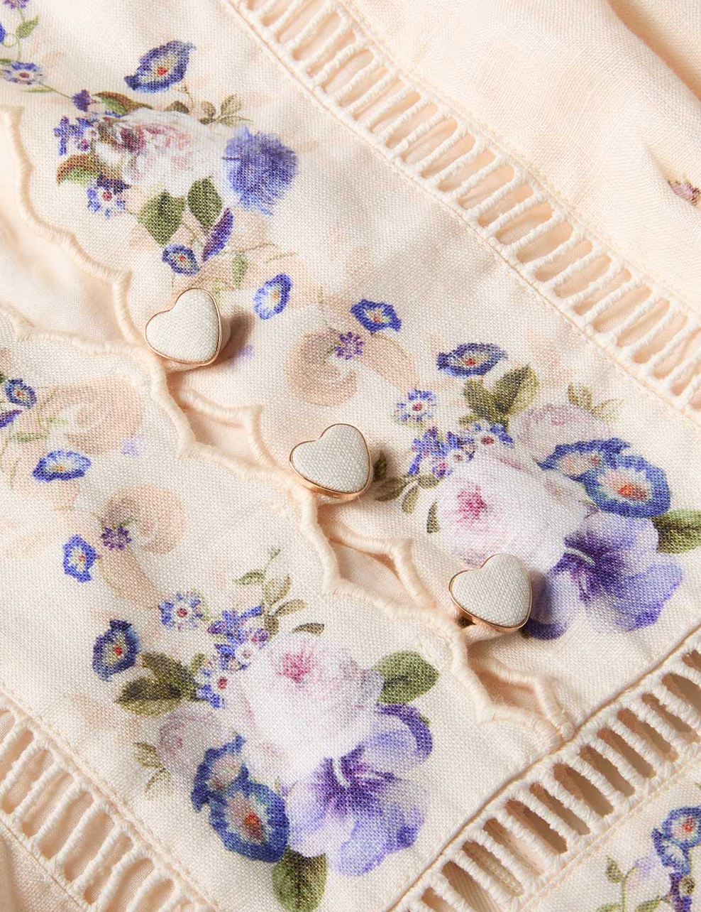Intricate scalloped trims, embroidery detailing, and rouleau buttons across the bust add a touch of refined craftsmanship, while the fitted waistband and softly flared skirt create a beautifully structured shape. Finished with an invisible centre-back zip for easy wear.
